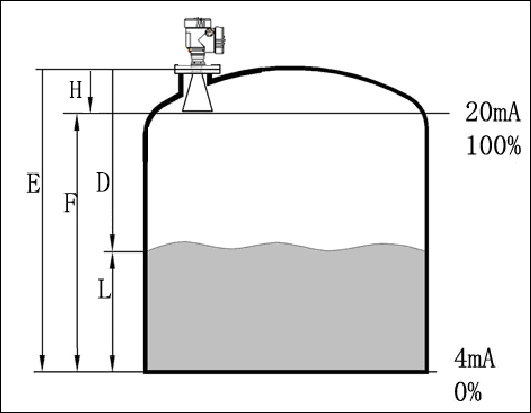 左图示例:雷达距离物料表面的距离"D"与脉冲的时间行程"T"成正比:D=C×T/2;其中"C"为对应波段传输速度;因空罐的距离"E"已知,则物位"L"为:L=E-D;通过设置空罐高度"E"(=零点=0%),满罐位置"H"(=满点=100%),定义雷达物位计输出信号的零点和满点,"F"则是实际物料测量范围(F=E-H),如果H设为"0"时F=E。